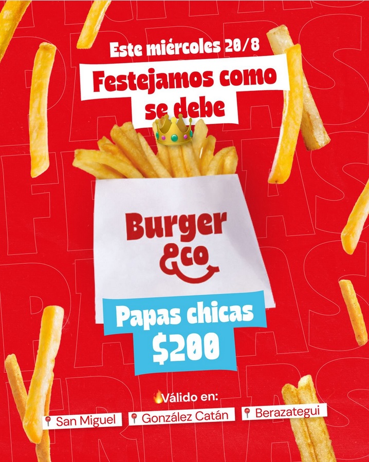 Burger & Co ofrecerá a sus clientes papa fritas a $200 en sus locales del partido de Berazategui en el Paseo Ardora, González Catán en el Catán Shopping y en San Miguel, Av. Pte. J. D. Perón 1200.