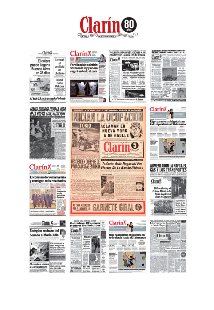 Clarín cumple 80 años informando, interpretando y siendo parte activa de la vida social, política, cultural y económica del país. Desde su primera edición el 28 de agosto de 1945, el diario ha sabido transformarse para responder a las necesidades de su tiempo, evolucionando en sus formatos y plataformas para llegar a nuevas audiencias sin perder de vista su compromiso con el periodismo de calidad.