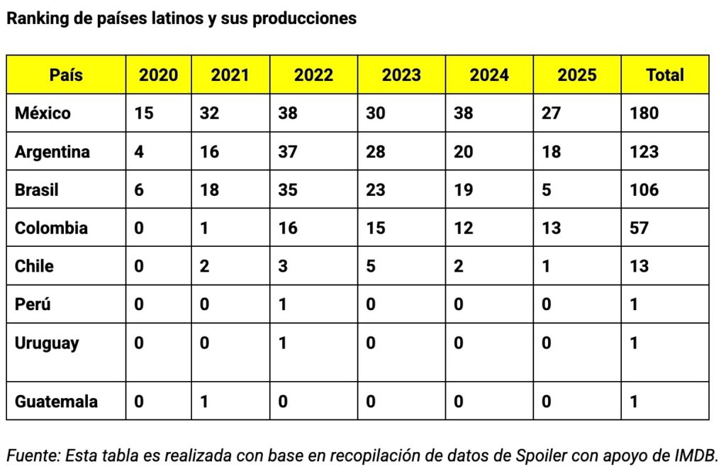 Según un estudio de la plataforma de entretenimiento Spoiler, que recopiló datos desde 2020 hasta 2025, el aumento productivo tiene un motor principal: Netflix. La plataforma fue pionera con su apuesta regional en 2015, lanzando la exitosa serie Club de Cuervos. Desde entonces, el catálogo se ha llenado de títulos producidos en la región.