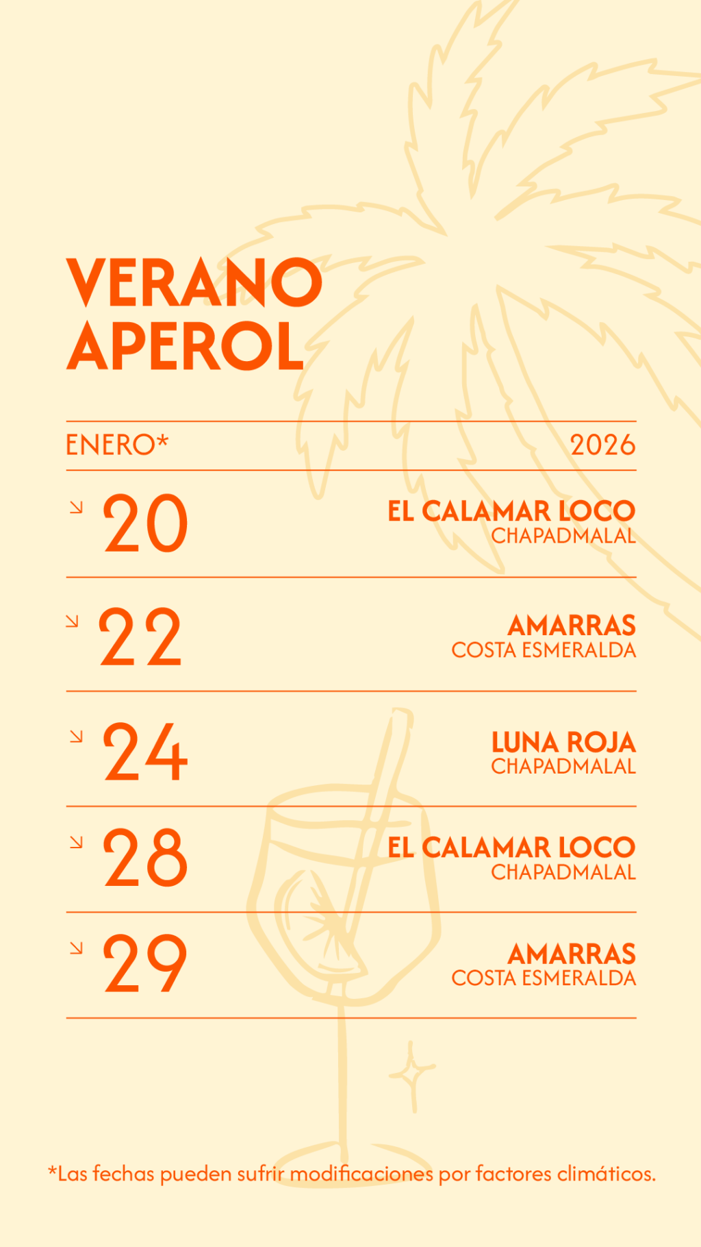 Durante enero y febrero, la experiencia recorre distintos puntos clave de la costa atlántica. En cada encuentro, la música acompaña el atardecer y la barra ofrece un precio promocional en Aperol. En Chapadmalal, los sunsets tienen lugar los miércoles en Calamar Loco, mientras que Mar del Plata suma encuentros los domingos en Samsara, entre otros espacios. Más adelante, la propuesta continúa en Costa Esmeralda, con sunsets en Amarras el 23 y 30 de enero.