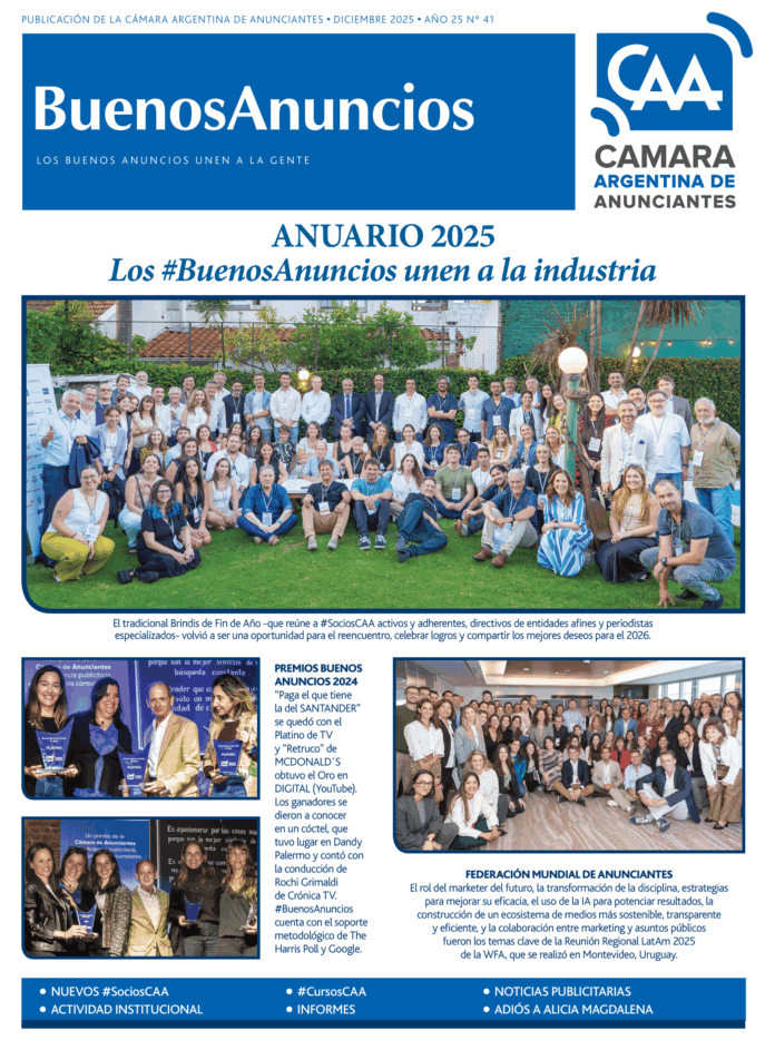 La Cámara Argentina de Anunciantes (CAA), entidad que nuclea a las empresas anunciantes más importantes del país, presenta su Revista Buenos Anuncios 41 • Anuario 2025, una publicación que reúne los principales hitos, actividades y contenidos que marcaron el año, así como las acciones y gestiones desarrolladas en favor de la industria publicitaria y de sus asociados.