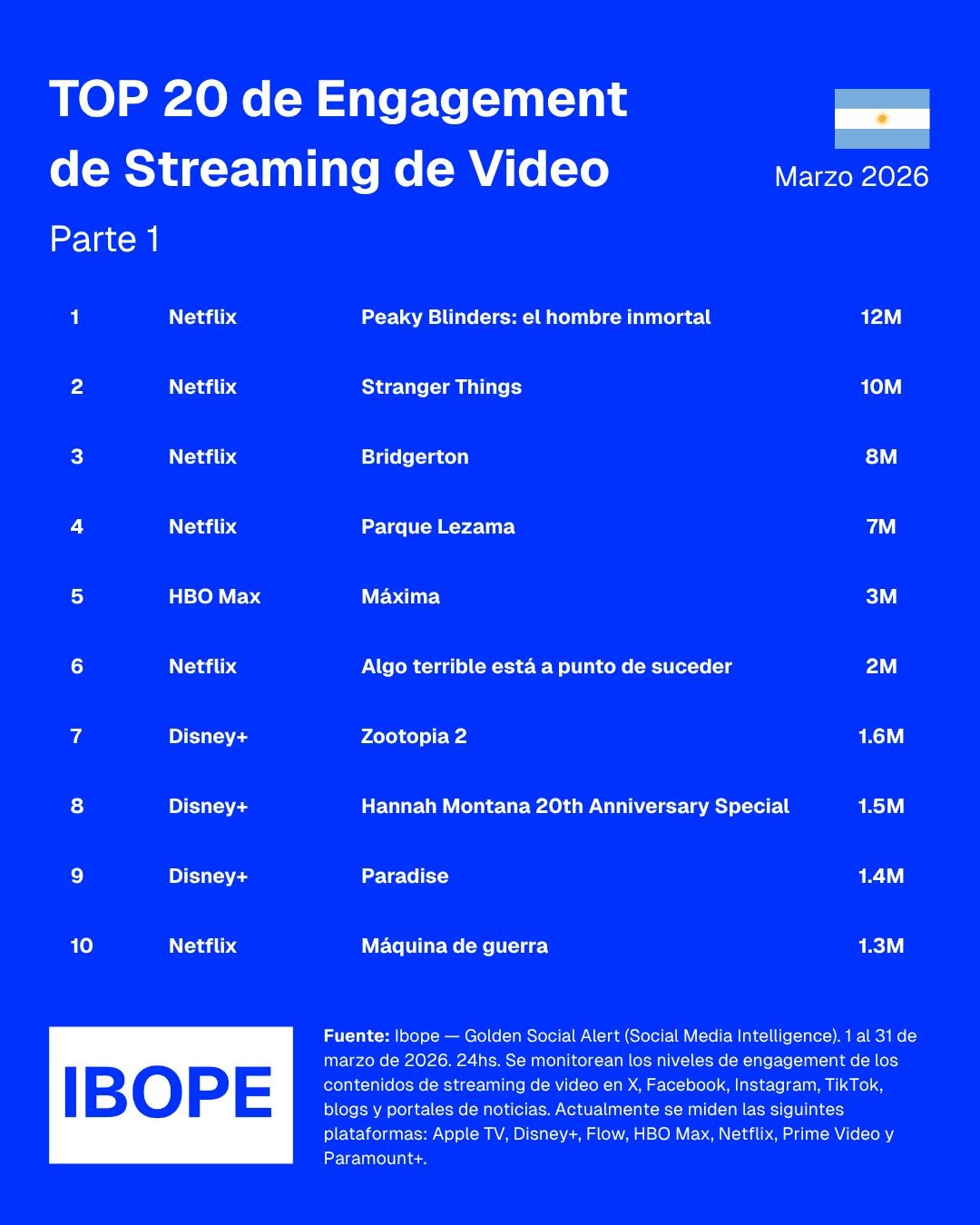 Algunas de los otros contenidos con mayor cantidad de vistas y potencial alcance de sus menciones generadas fueron “Máxima” (HBO Max), “Algo terrible está a punto de suceder” (Netflix), “Zootopia 2” (Disney+), “Hannah Montana 20th Anniversary Special” (Disney+), “Paradise” (Disney+), “Máquina de guerra” (Netflix), “La trampa” (Netflix), “Esa noche” (Netflix), “Frankenstein” (Netflix), “The Handmaid’s Tale” (Disney+), “En el barro” (Netflix), “Rooster Fighter” (Disney+), “Daredevil: Born Again” (Disney+), “Oscar” (HBO Max), “Vladimir” (Netflix) y “Harry Hole” (Netflix).