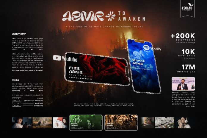 Fundación Escazú y VML Chile han lanzado una innovadora campaña para despertar a la sociedad chilena ante la alarmante realidad del cambio climático. Bajo el lema “Concientizar sobre lo dormidos que estamos”, la campaña utiliza la popularidad de los sonidos de la naturaleza, que generalmente se usan para relajarse, para revelar una dura verdad: esos sonidos están basados en desastres naturales causados por el cambio climático.