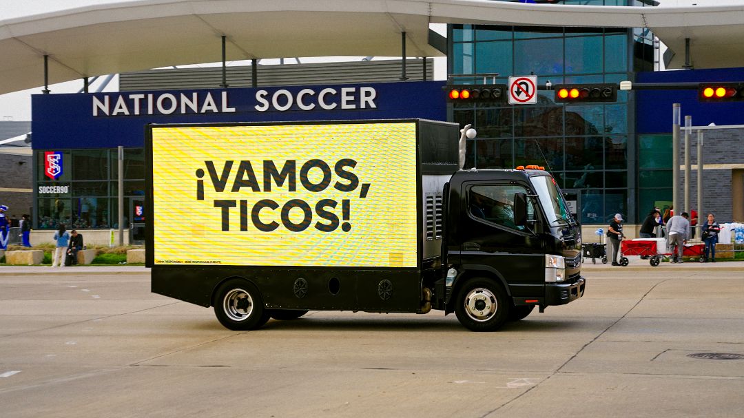 Con mensajes de apoyo con frases icónicas y lugares emblemáticos para los costarricenses como el “Pura Vida”, “la Fuente de la Hispanidad” y las “calles de Chepe” los camiones recorrerán, como ya lo han hecho durante los partidos amistosos en marzo, las inmediaciones de los estadios donde se llevan a cabo los partidos. El objetivo es crear un ambiente festivo y emocionante para los fanáticos presentes que también podrán fotografiarse usando de telón de fondo las imágenes de las publicidades.