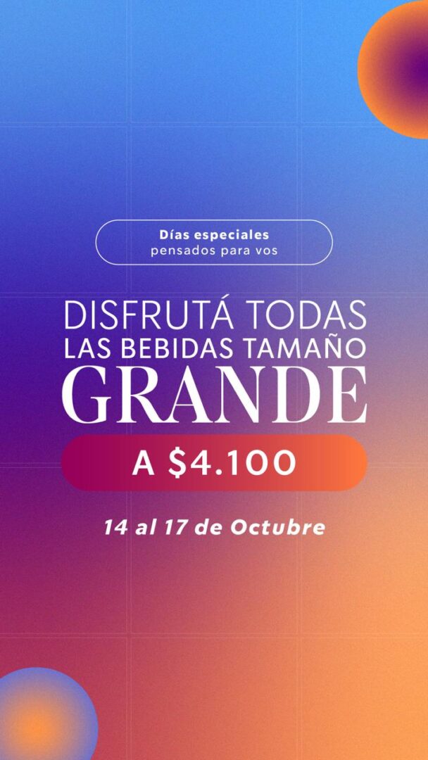 Del 14 al 17 de octubre, los clientes podrán disfrutar de bebidas grandes por solo $4.100 pesos en Argentina. Para aquellos que prefieren realizar pedidos a través de servicios de delivery, esta promoción también estará disponible.