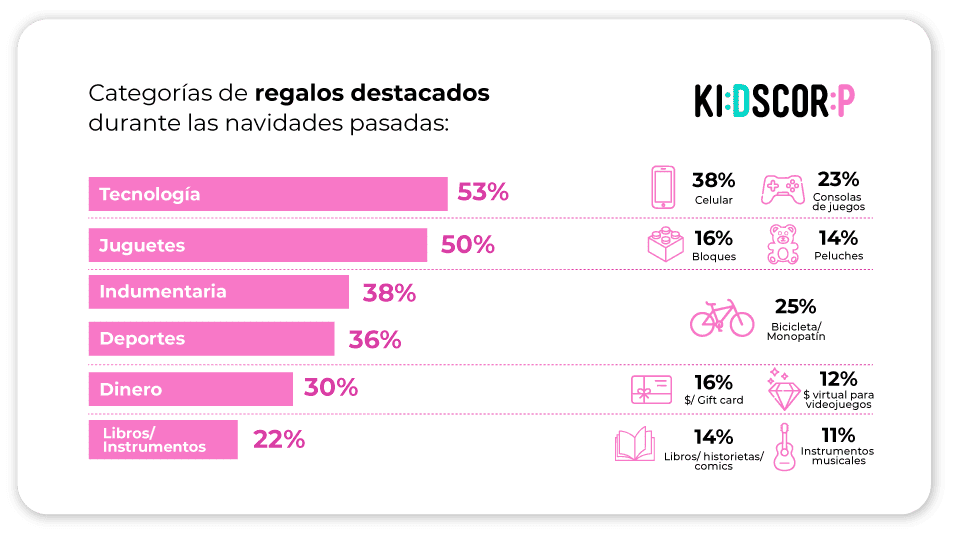 - Teens (13-17 años): Tecnología, como celulares y audífonos (41%), indumentaria y accesorios de moda (36%) y dinero o tarjetas de regalo (18%).