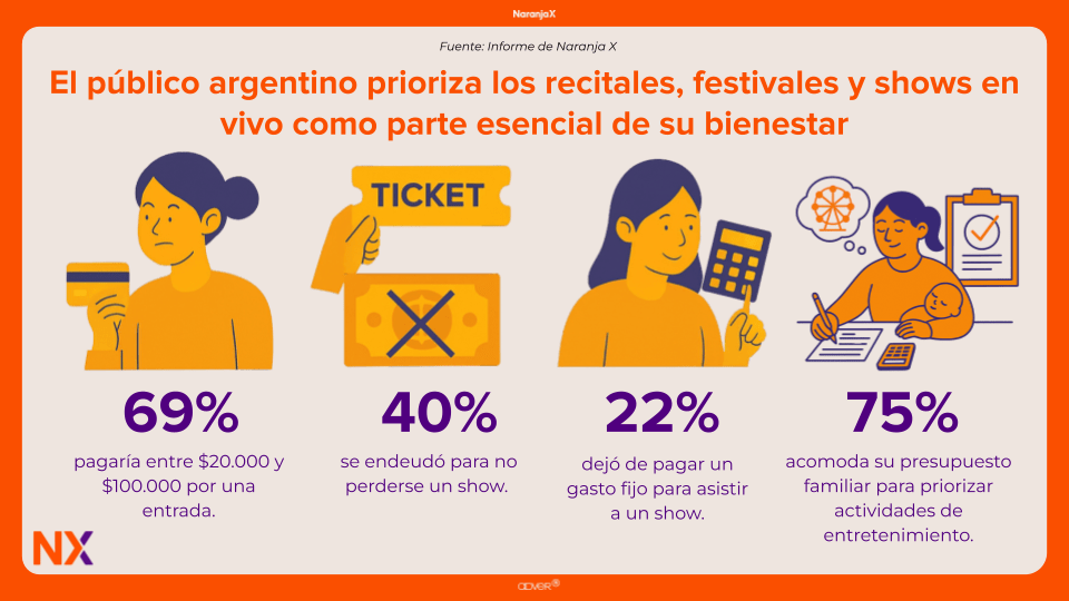En un país donde la emoción cotiza, el 69% de los encuestados dijo estar dispuesto a pagar entre $20.000 y $100.000 por una entrada, aunque eso implique hacer malabares financieros. De hecho, 4 de cada 10 personas admiten haberse endeudado alguna vez para no perderse un evento y el 22% dejó de pagar un gasto fijo para asistir a un show. Aún más, el 75% organiza su presupuesto familiar para incluir actividades de entretenimiento como prioridad.