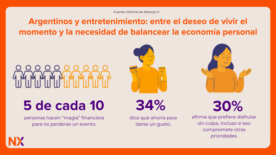 La tensión entre el deseo de vivir el momento y la necesidad de balancear la economía personal atraviesa todo el estudio: 5 de cada 10 personas hacen “magia” financiera para no perderse un evento, mientras un 34% dice que ahorra para darse un gusto y otro 30% afirma que prefiere disfrutar sin culpa, incluso si eso compromete otras prioridades.